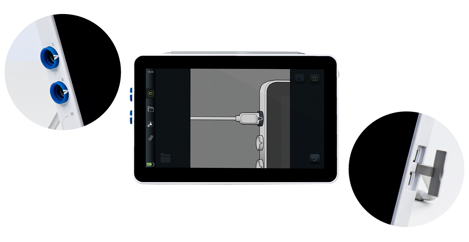 電源を入れて数秒で起動し、ライブ画像を確認できます。フル充電で3時間以上(新品の場合)バッテリのみで使用でき、手技後は消毒ワイプで清拭します。